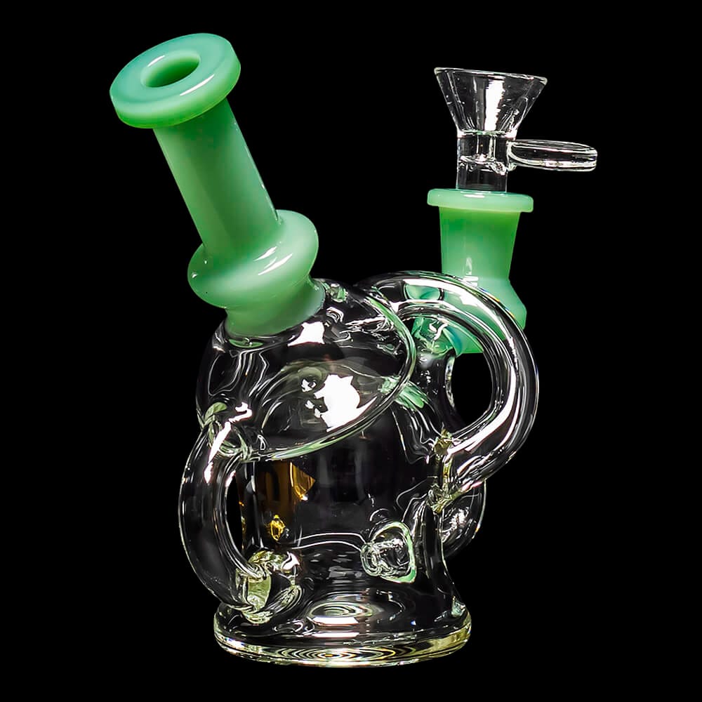 Standing at approximately 6 inches tall, this unique recycler features a striking mint green glass stem, joint, and mouthpiece that are sure to catch the eye of any enthusiast. The expert design includes a fixed downstem and a superb 14mm male bowl, guaranteeing a smooth, enjoyable experience.