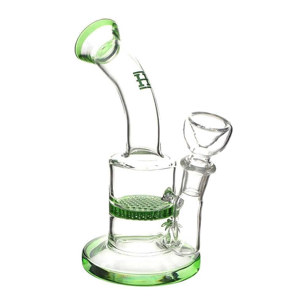 The 6" Hemper Mini Honeycomb Water Pipe condenses all the benefits of a honeycomb perc into a conveniently sized 6" glass pipe. The result is prime diffusion that?s comfortably compact. Created by Hemper Co. from high grade borosilicate, the piece features a chamber bisected by a honeycomb perc that serves up sizeable yet smooth hits. A beveled neck, adorned with the Hemper Co. "H", allows for a cozy smoking experience.