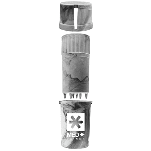 This unique Medtainer Storage w/ Grinder in Charcoal Marble Swirl with a sleek white logo is a game changer for anyone who appreciates convenience and style.