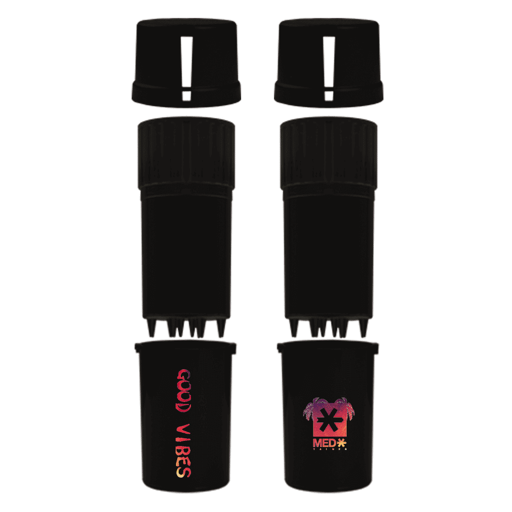 Perfectly designed for the on-the-go lifestyle, this 20 Dram Medtainer allows users to grind and store herbs swiftly and efficiently. Its unique patented design means you can take your passions anywhere without worrying about odors escaping or mess spilling. It's not just practical; it’s a stylish accessory that screams 'Good Vibes' wherever you go!