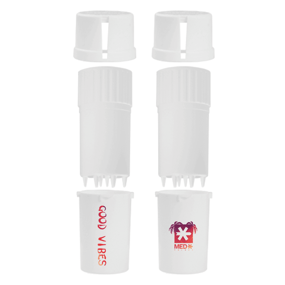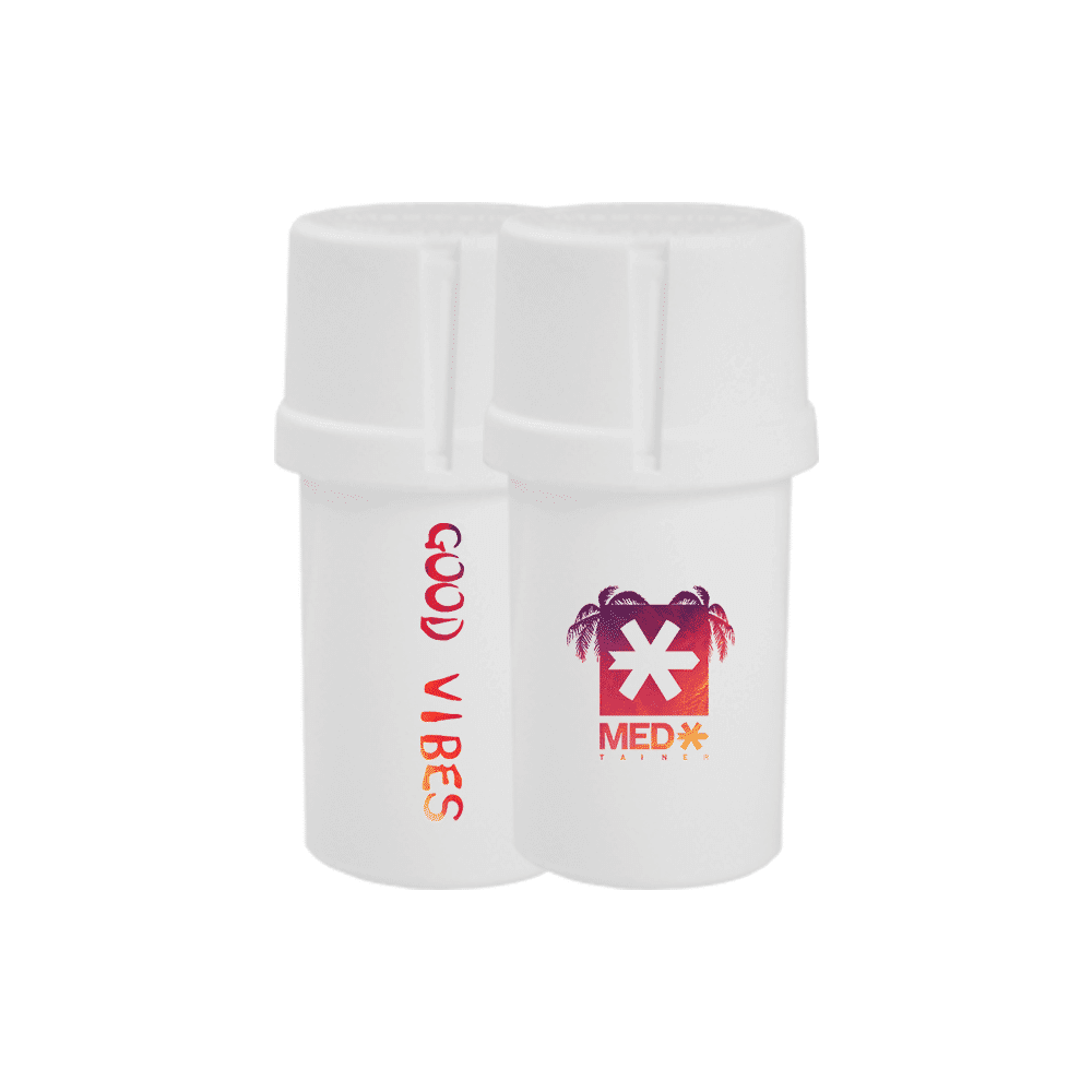 Medtainer | Storage w/ Grinder “Straight Chellin’ / Good Vibes” White (1 Medtainer |) – 20 Dram | Elevate Your Grinding Experience with Style