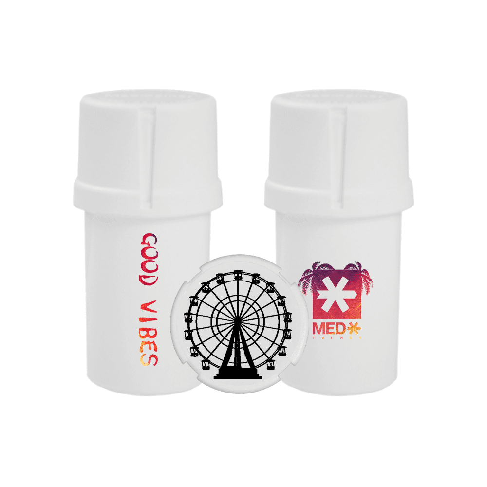 Medtainer | Storage w/ Grinder “Straight Chellin’ / Good Vibes” White (1 Medtainer |) – 20 Dram | Elevate Your Grinding Experience with Style